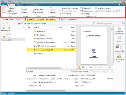 Le ruban comporte des onglets contenant des commandes pour effectuer des opérations sur des documents enregistrés dans des bibliothèques et les modifier, ainsi que des commandes pour envoyer et recevoir des télécopies, et imprimer des documents.