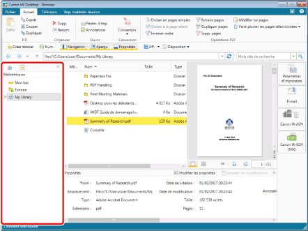 La Fenêtre de navigation sert à organiser les différentes bibliothèques et à répertorier la structure des dossiers dans les bibliothèques. Elle permet également de répertorier les conditions de recherche enregistrées.