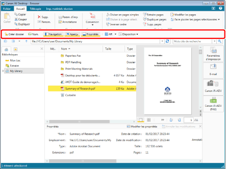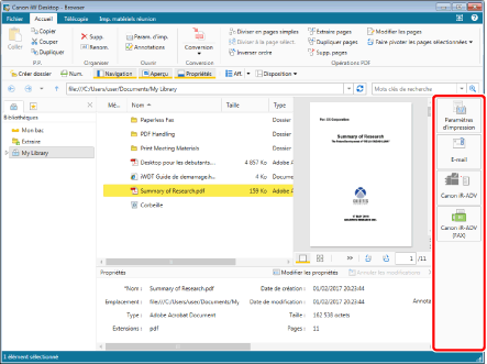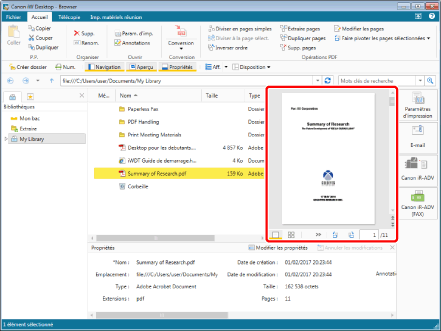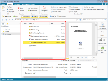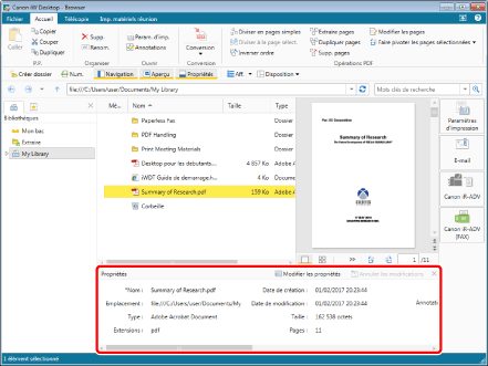 La Fenêtre des propriétés affiche les informations (propriétés) relatives au document ou au dossier sélectionné dans la Fenêtre de navigation ou la Fenêtre de navigation de la liste des fichiers.