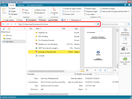 La barre d'adresse affiche le chemin d'une bibliothèque, de Mon bac ou d'un dossier donné. Il est également possible de cliquer sur