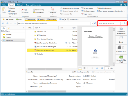 La Fenêtre d'aperçu affiche un aperçu du document sélectionné dans la Fenêtre de navigation de la liste des fichiers.