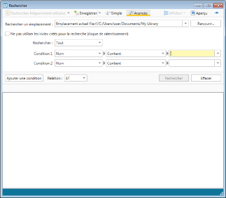 La barre de recherche simple permet d'entrer des mots-clés afin d'effectuer une recherche simple. Vous avez également la possibilité de procéder à une recherche détaillée en indiquant un mot-clé correspondant à des propriétés de la cible de recherche.