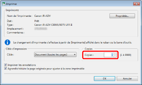 La boîte de dialogue [Imprimer] s'affiche lorsque la case [Afficher la boîte de dialogue d'impression/envoi de télécopies] est cochée. Dans ce cas, passer à l'étape 4.