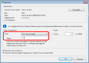 L'ordre de saisie de la [Plage] ne correspond pas à l'ordre d'impression. Que l'on indique "1,2" ou "2,1", les pages sont imprimées dans l'ordre "1,2".
