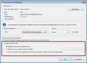 Si l'option [Imprimer les enregistrements spécifiés] a été sélectionnée, suivre la procédure ci-dessous pour spécifier l'enregistrement à imprimer.