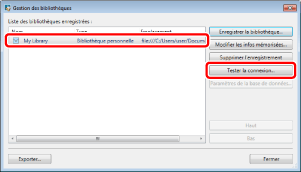 Sélectionnez une bibliothèque pour laquelle vous souhaitez tester la connexion, puis cliquez sur [Tester la connexion] dans la boîte de dialogue [Gestion des bibliothèques].