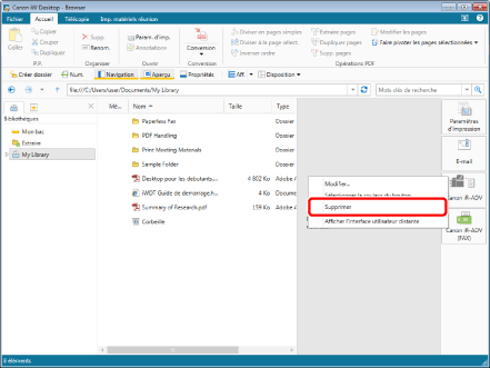 Sinon, sélectionnez le menu [Fichier] > [Outils] > [Paramètres de la barre de sortie] > (nom de l'imprimante) > [Supprimer].