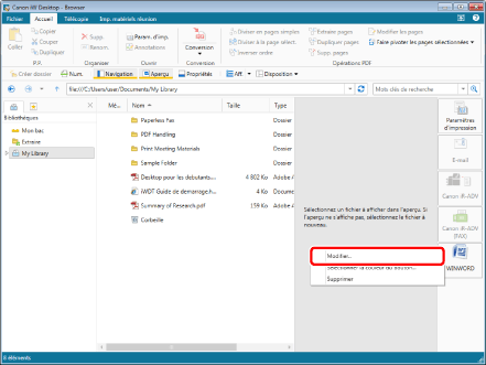 pour le bouton de sortie application affiché sur le ruban ou la barre d'outils et en sélectionnant [Modifier]. Si un bouton de sortie n'est pas affiché sur le ruban ou la barre d'outils, consulter les sections suivantes pour l'afficher. |