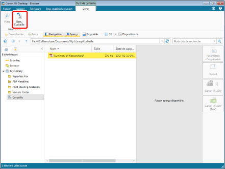 L'utilisateur qui a déplacé des dossiers/documents dans la Corbeille peut les restaurer à partir de celle-ci.