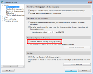 La fonction d'aperçu de Desktop Browser et la fonction d'aperçu de l'Explorateur Windows sont identiques. L'activation du paramètre de Desktop Browser pour prévisualiser des documents Office est indépendante du paramètre [Afficher les gestionnaires d’aperçu dans le volet de visualisation] dans les options des dossiers de l'Explorateur Windows. La prévisualisation est effectuée indépendamment pour chaque type de fichier et, bien que cela se produise rarement, il peut s'avérer impossible de prévisualiser des types de fichiers uniques. Dans ce cas, vérifier s'il est possible de prévisualiser le type de fichier dans l'Explorateur Windows.