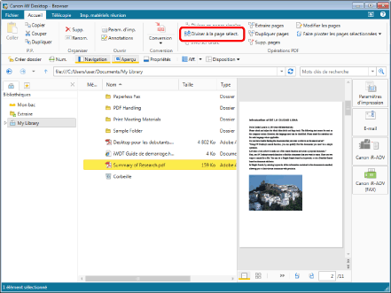 Le document PDF est divisé avant la page affichée/sélectionnée.
