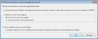 La boîte de dialogue [Diviser le document au niveau de la page sélectionnée] ne sera plus affichée. Le mode de traitement sélectionné dans [Traitement du document original] sera appliqué au document d'origine.
