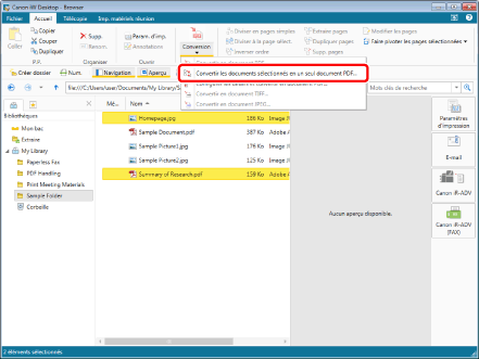 (Conversion) sur le ruban, puis sélectionner [Convertir les documents sélectionnés en un seul document PDF].