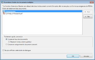 Même si la boîte de dialogue n'est pas configurée pour s'afficher, il est possible de l'afficher en cochant la case [Sélectionnez l'ordre de traitement des documents lors de la conversion des documents sélectionnés en un document PDF unique].