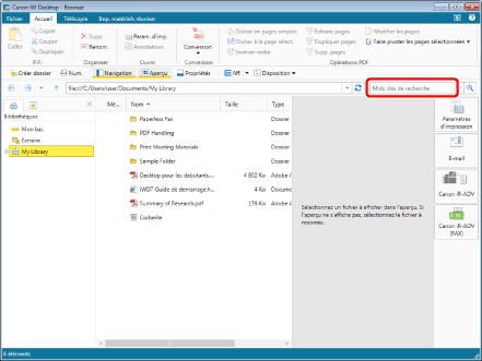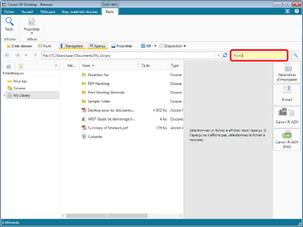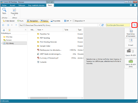 Les documents trouvés lors de la recherche peuvent être prévisualisés sur l'Écran de recherche. Pour plus d'informations, consulter la section suivante.