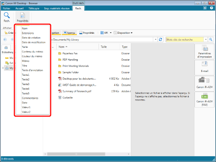 (Propriétés) dans le ruban permet d'afficher les types de propriétés pouvant faire l'objet d'une recherche dans la bibliothèque sélectionnée.Pour plus d'informations sur les propriétés, consulter la section suivante.