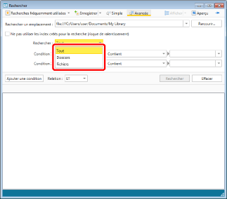 Effectue la recherche dans les dossiers. Si [Dossiers] est sélectionné, seules des propriétés de dossiers peuvent être sélectionnées dans les conditions de recherche.