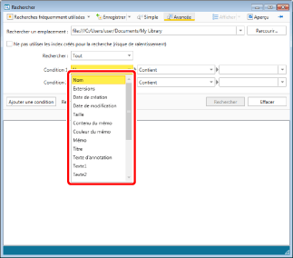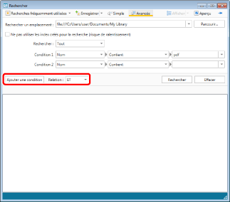 Lorsque [ET] est sélectionné, les résultats de la recherche qui incluent toutes les conditions de recherche définies dans [Condition] sont affichés.
