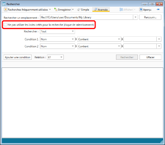 Bibliothèques réseau : bibliothèques disponibles pour les recherches en texte intégral. (Vous devez décocher la case [Ne pas utiliser les index créés pour la recherche (risque de ralentissement)].)