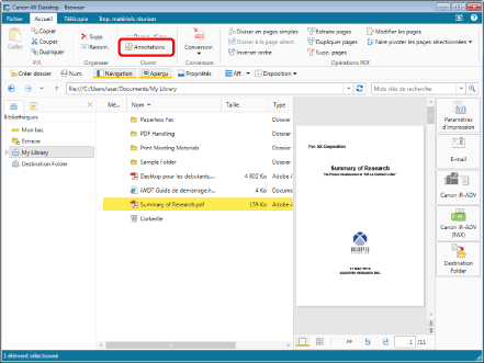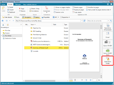 Si l'une des opérations suivantes est effectuée sans sélectionner de document, le Dossier de destination du document est sélectionné dans la Fenêtre de navigation, et il est possible de vérifier les dossiers et documents dans le Dossier de destination du document de la Fenêtre de navigation de la liste des fichiers.