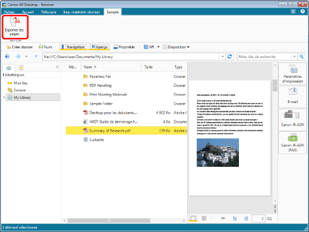 Vous pouvez exporter (enregistrer) la page de document PDF sélectionnée dans la Fenêtre d'aperçu vers un Dossier Windows.