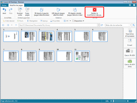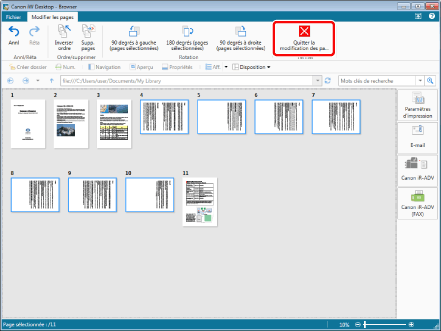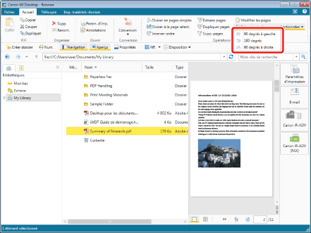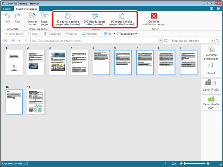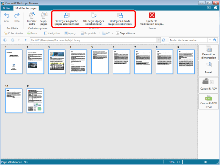 Ou, cliquer avec le bouton droit sur la page et sélectionner [Faire pivoter les pages sélectionnées] > [90 degrés à gauche]/[180 degrés]/[90 degrés à droite].