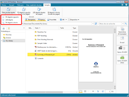 Cliquer sur (Faire pivoter les pages sélectionnées de 90 degrés à gauche et enregistrer)/ (Faire pivoter les pages sélectionnées de 90 degrés à droite et enregistrer) dans la Fenêtre d'aperçu.