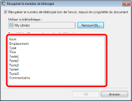 Les numéros de télécopie ne peuvent être automatiquement récupérés que depuis des documents stockés dans une bibliothèque que vous avez sélectionnée dans la boîte de dialogue [Récupérer le numéro de télécopie]. Les numéros de télécopie ne peuvent pas être récupérés depuis des documents d'autres bibliothèques, même si les numéros de télécopie sont paramétrés dans leurs propriétés.