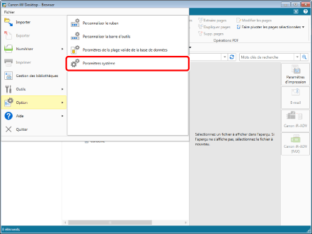Sélectionnez le menu [Fichier] > [Option] > [Paramètres système].
