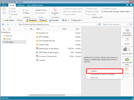 pour le bouton de sortie bac de destination affiché sur le ruban ou la barre d'outils et en sélectionnant [Modifier]. Si un bouton de sortie n'est pas affiché sur le ruban ou la barre d'outils, consulter les sections suivantes pour l'afficher. |