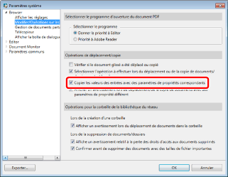 [Paramètres système] > [Browser] > [Modifier/Opérations sur les documents] > [Copier les valeurs des entrées avec des paramètres de propriétés correspondants]
