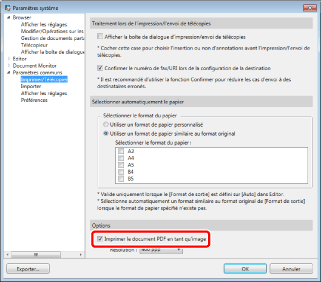 Si la case [Imprimer le document PDF en tant qu'image] est cochée, tous les documents PDF sont imprimés ou envoyés en tant qu'images. Pour les imprimer ou les envoyer en tant que documents PDF, décocher la case.