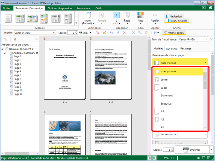 Si le format de papier en sortie est défini sur un paramètre autre que [Auto (Format)] pour un document comportant plusieurs orientations de page ou plusieurs formats, les pages dont l'orientation ou le format diffère de l'orientation ou du format du papier courant sont automatiquement agrandies ou réduites en fonction de la largeur du papier (mais elles ne font pas l'objet d'une rotation automatique).