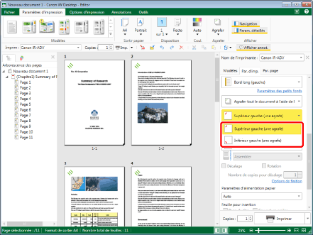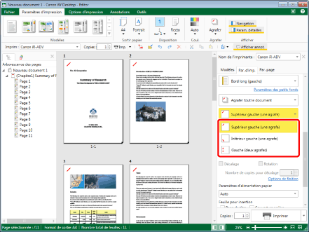Les paramètres qu'il est possible de définir pour la position Éco (sans agrafe) dépendent du type d'imprimante sélectionné dans [Imprim], de l'orientation/du format du papier en sortie et de l'emplacement de la reliure.