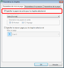 Lorsque le format du papier en sortie est défini sur [Auto (Format)] pour l'ensemble du document ou pour chaque chapitre et que la case [Spécifier le mise en page pour le chapitre sélectionné] n'est pas cochée, si la mise en page est définie sur une valeur autre que [1 sur 1] pour l'ensemble du document, le format du papier en sortie défini pour le chapitre est désactivé.