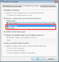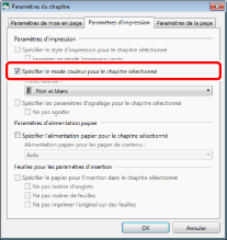 Si l'impression de brochure est définie lors d'un changement de mode couleur par chapitre, le mode couleur des pages des chapitres dont les paramètres n'ont pas été modifiés peut également changer.