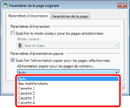 Il est également possible de cliquer avec le bouton droit de la souris sur la page dont les paramètres doivent être modifiés dans l'onglet [Arborescence des pages] de la Fenêtre de navigation et de sélectionner la source d'alimentation à définir dans [Alimentation papier pour les pages d'originaux].