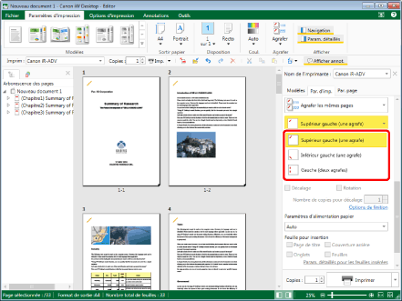 Les paramètres qu'il est possible de définir pour la position Éco (sans agrafe) dépendent du type d'imprimante sélectionné dans [Imprim], de l'orientation/du format du papier en sortie et de l'emplacement de la reliure.