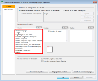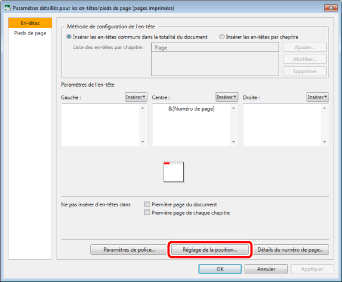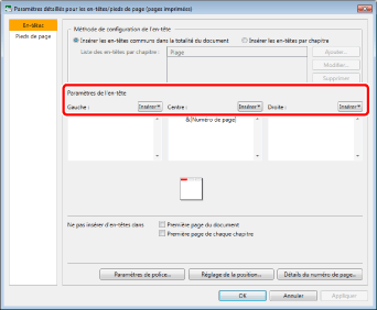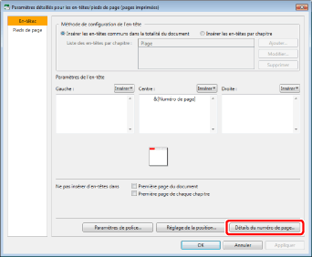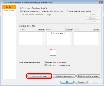 Pour plus d'informations sur l'affichage de la boîte de dialogue [Paramètres détaillés pour les en-têtes/pieds de page (pages imprimées)]/[Paramètres détaillés pour les en-têtes/pieds de page (pages d'originaux)], consulter :