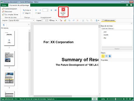 Pour ne créer que la mise en page et importer ultérieurement la base de données, sélectionner [Définir des champs et modifier une mise en page] et cliquer ensuite sur [OK]. Le Mode Paramètres d'impression de Publipostage démarre et l'onglet [Impression de publipostage] s'affiche dans le ruban.