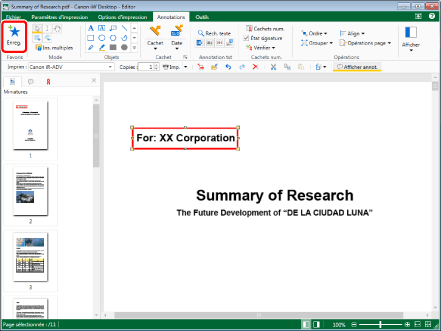Une version compacte des annotations enregistrées est enregistrée en tant que bouton dans la liste des favoris dans le ruban et dans la Fenêtre Détails.