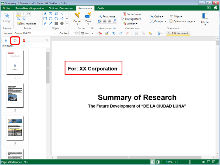 L'onglet [Miniatures] s'affiche par défaut dans la Fenêtre de navigation du Mode Annotations.