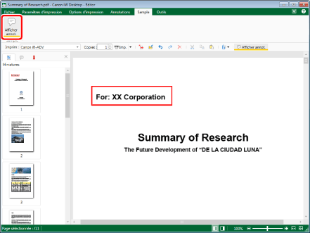 Si la case [Afficher la boîte de dialogue d'impression/envoi de télécopies] est décochée dans [Paramètres système], un message de confirmation s'affiche lorsque l'une des opérations suivantes est effectuée alors que les annotations sont masquées. Pour imprimer des annotations, cliquer sur [Imprimer avec des annotations].