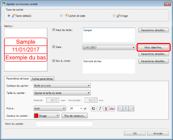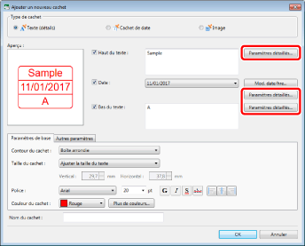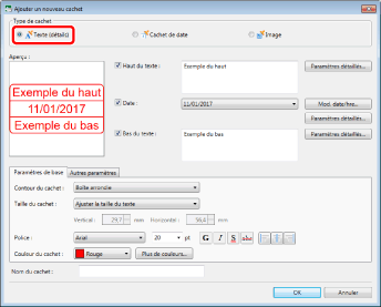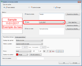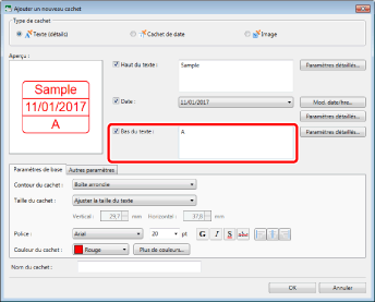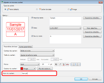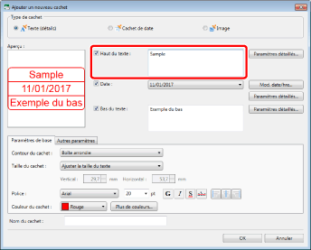 Si vous n'entrez pas de nom dans [Nom du cachet], il est automatiquement défini d'après le texte saisi dans [Haut du texte]/[Bas du texte].