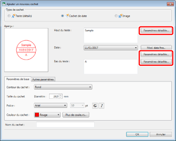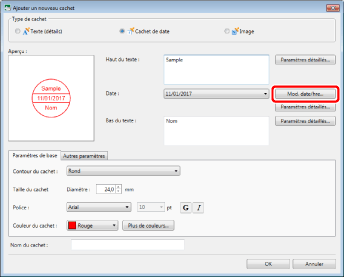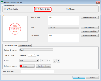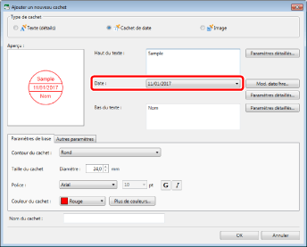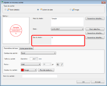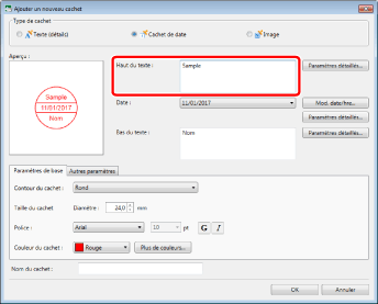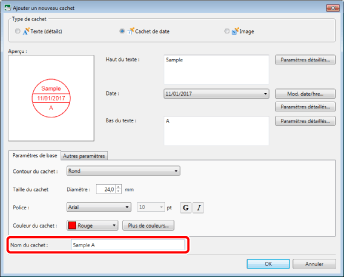 Si vous n'entrez pas de nom dans [Nom du cachet], il est automatiquement défini d'après le texte saisi dans [Haut du texte]/[Bas du texte].