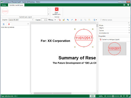 Vous pouvez effectuer les opérations suivantes sur les cachets numériques insérés à un emplacement provisoire.