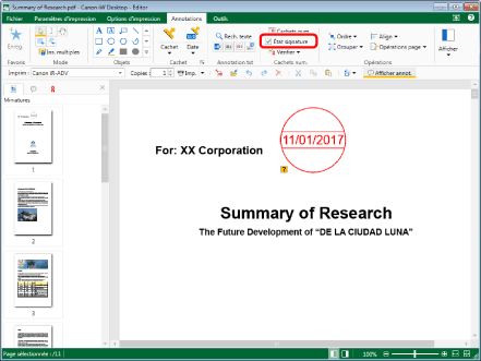 L'état de la signature s'affiche dans le coin inférieur gauche du cachet numérique dans la Fenêtre de travail et fournit les mêmes informations que l'icône affichée en regard de chacune des informations de l'onglet [Liste des signatures] dans la Fenêtre de navigation.