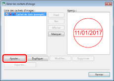 Si le cachet est un cachet numérique enregistré automatiquement lors de l'installation, ou l'une de ces copies, le format de données de date « Date courte » ou « Date complète » (selon la sélection) défini sous [Région et langue] dans Panneau de configuration, sur l'ordinateur que vous utilisez, est toujours appliqué. En revanche, s'il s'agit d'un cachet numérique enregistré par l'utilisateur, le format de données de date sélectionné pendant l'enregistrement est conservé. En outre, lors de la modification du format de données de date d'un cachet numérique enregistré, le nouveau format est appliqué au cachet.