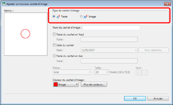 Quand [Texte] est sélectionné, vous pouvez enregistrer des cachets d'image qui utilisent un cercle englobant et la date et le texte spécifiés.