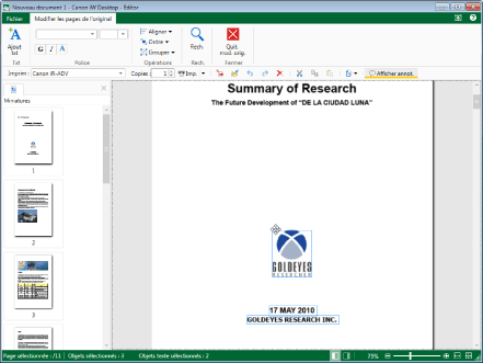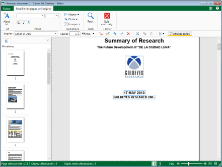 Si l'utilisateur sélectionne un objet dans la Fenêtre de travail, le nombre total d'objets sélectionnés et le nombre d'objets texte s'affichent sur la barre d'état.